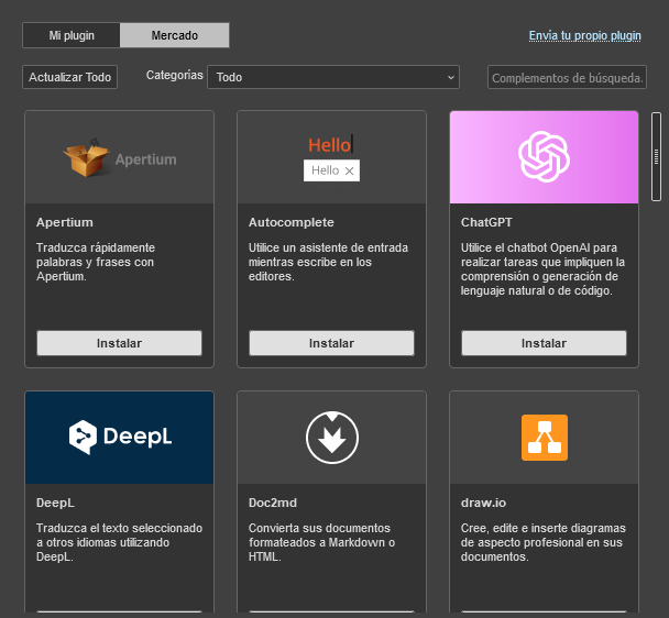 Tambi茅n podremos crear nuestro propio complemento con la opci贸n de env铆a tu propio plugin a trav茅s