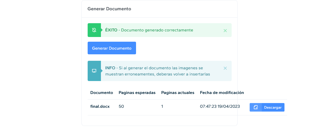 Para crear el Documento Final, debemos de pulsar el bot贸n Generar Documento y autom谩ticamente